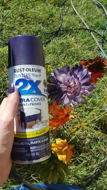 quería que se vea Halloweenish no fallish hacer decidí cambiar los colores de la flor. Pintura de aerosol púrpura toma lo polvo ligeramente sobre las flores blancas. Tomando dos verdes oscuro y una luz colocan sobre las flores amarillas. Luego tomar una pintura negro y gay Coloque suavemente sobre las flores de naranja.
