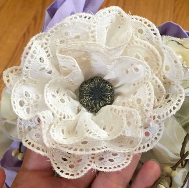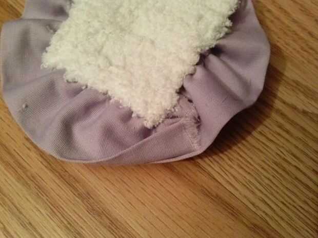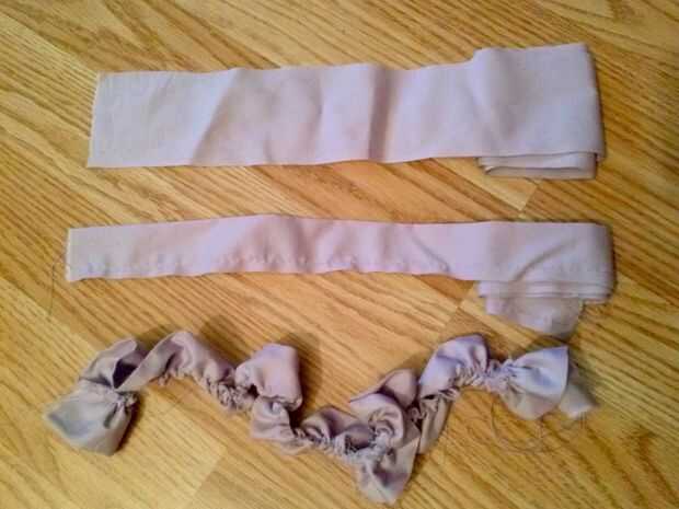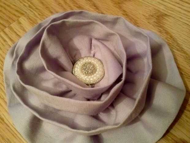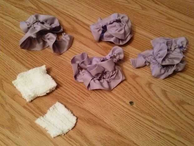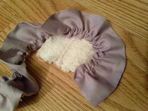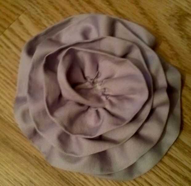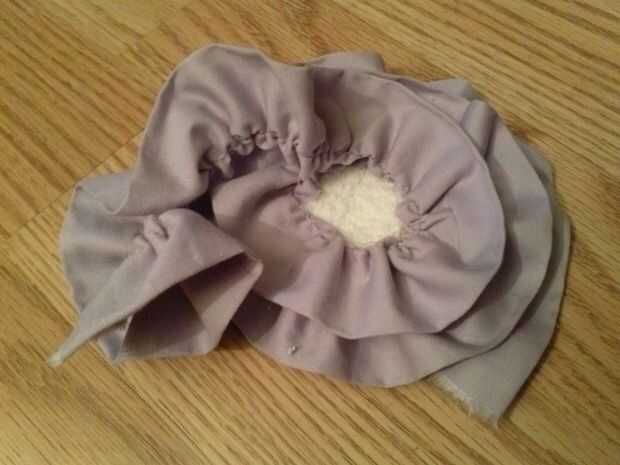 5. ahora con una pieza de forro y caliente pegamento, empezar a poner la tela recogida en un movimiento en espiral.