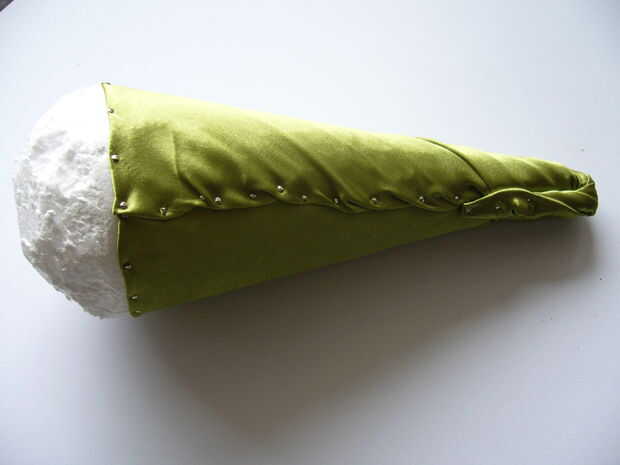 Alrededor de los bordes superiores del cono con un cuchillo. Tome el pedazo restante de tela verde y envolver el cono en él. Esto es un poco difícil de admitir, pero sea paciente. Utilice los pernos pequeños y pin todo donde sea necesario.