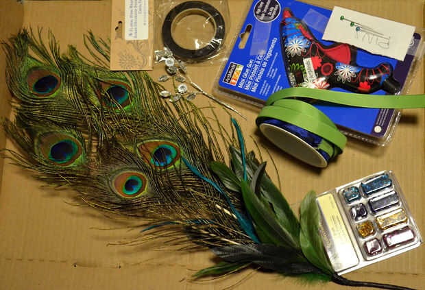 Tenía un tesoro en un aerosol de la pluma de pavo real. Proporcionó cuatro plumas de pavo real extra (por si acaso), basan de pequeñas plumas de colores complementarios y una longitud de alambre floral incluido para la flor en el ojal. Recomiendo buscar algo similar.