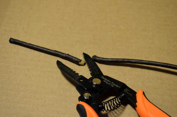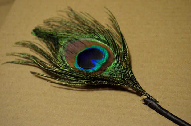 Seleccione una pluma de pavo real y corte desde el tallo. Coloque en la parte superior del cable con un pequeño toque de pegamento caliente. No te preocupes de recortar la pluma todavía.