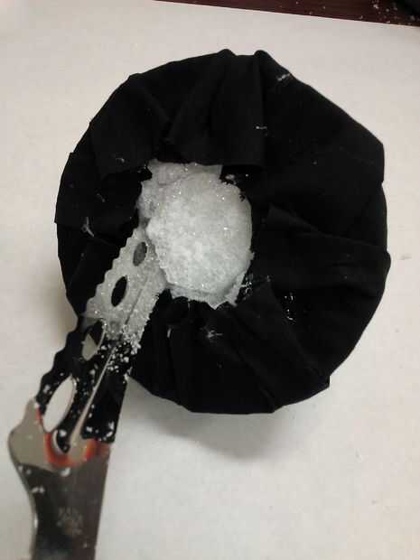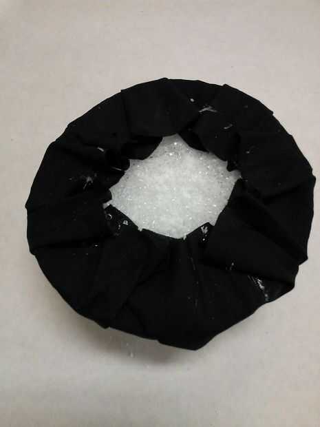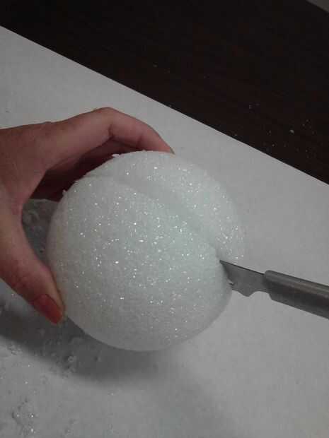 Usando un cuchillo filoso, cortar con cuidado la bola de espuma de poliestireno por la mitad. La pistola de pegamento de baja temperatura. Cubrir una mitad de espuma de poliestireno de la bola con el círculo de tela.