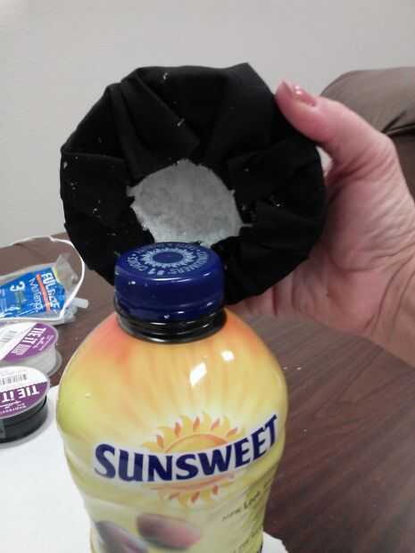 Lugar un níquel de tamaño cantidad de pegamento en la cima de la botella de jugo. Rápidamente Coloque la espuma en la tapa y pulse.