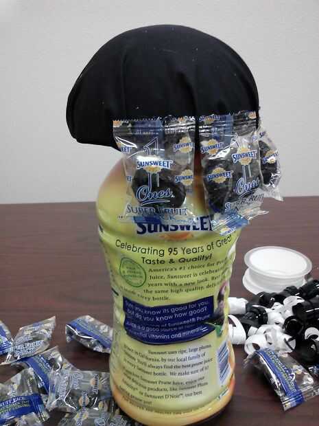 A partir del borde inferior de la espuma, pegamento las ciruelas individualmente envueltas alrededor del borde inferior de la espuma. Con tu pistola de pegamento de baja temperatura, coloque una pequeña cantidad de pegamento en el borde inferior de la espuma cubierta de tela. Presione la parte superior sellada de una ciruela pasa envuelta en la espuma. Presione hasta que el pegamento se seca, unos 10 segundos. Pegue un pedazo de cinta rizado sobre la espuma entre cada ciruela envuelta. Pegue la siguiente capa alrededor de la espuma de 1/2" por encima de la primera fila. Pegamento más rizada cinta en espuma. Continúan las ciruelas del pegamento y la cinta sobre la espuma. Hacer un arco con varios trozos largos de cinta. Pegue el moño en la parte superior de la espuma.