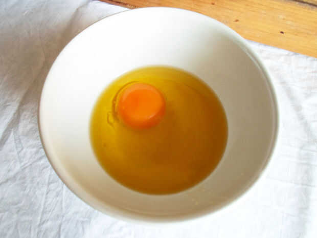 poner el huevo en un cuenco, añadir el aceite de oliva y 2 cucharaditas de sal.