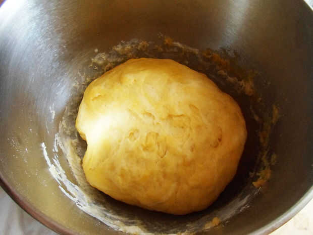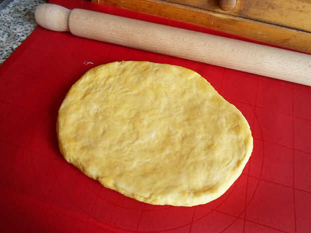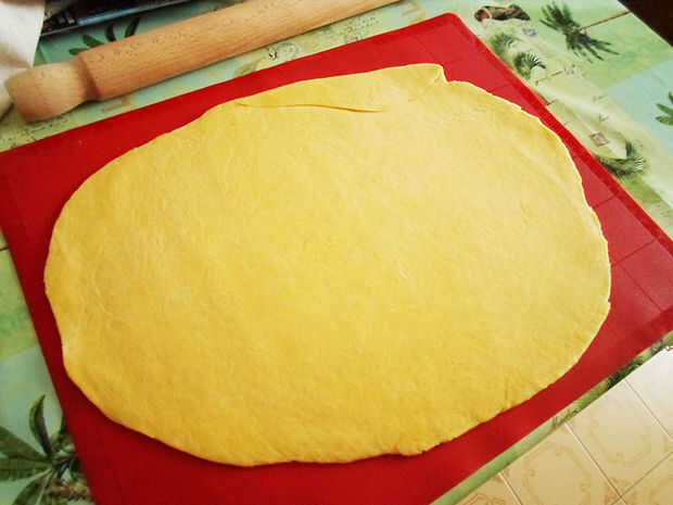 Después de que su masa ha con levadura, extenderlo sobre una mesa con un rodillo, hasta que se convierte en un rectángulo grande, de unos 5mm de espesor (0,19 pulgadas).