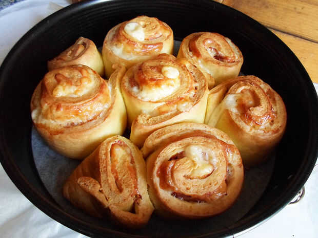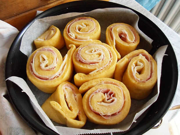 Rollos de media luna relleno de jamón y queso. Perfecto para el almuerzo o un divertido después de la merienda escolar.Ingredientes6 Rollos de cena Rhodes, descongelado a temperatura ambienteaderezo de miel mostaza 2 cucharadas16 lonchas finas jamón