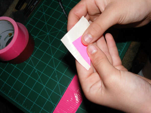 Una vez que han cortado a las plazas realizará una de las esquinas y pegarlo a la parte pegajosa de la cinta. luego se pliega otro