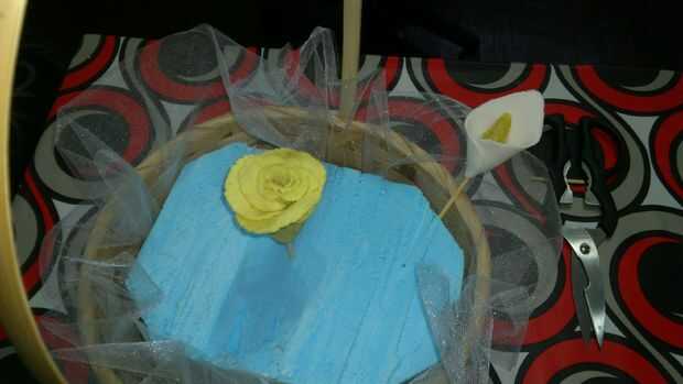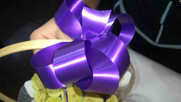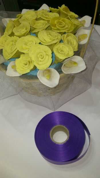 Después de que hice todo cortar pequeños trozos de cinta y ponerlos cerca de las rosas y uno grande en la manija de la cesta.