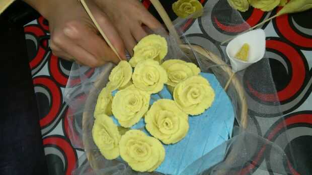 Cuando todas las flores se secan se pueden empezar a arreglar en la cesta. I primer cutt la pieza para que quede dentro sobre el tul - otra vez con la forma deseada. Y que comencé stabing la espuma de poliestireno con las flores.