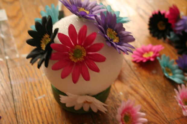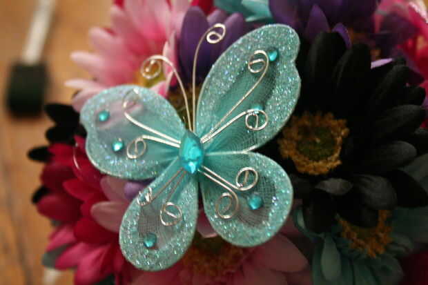 Ahora, meter las flores en la bola de la espuma y añadir unos puntos de pegamento para unir unas mariposas en unos pocos lugares.