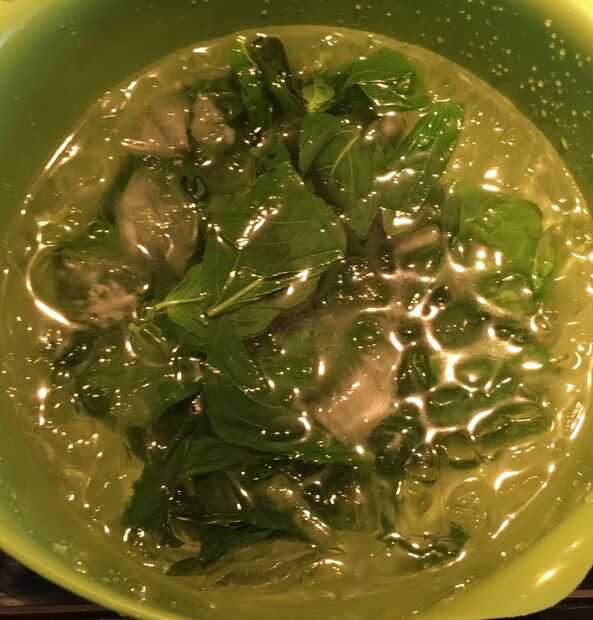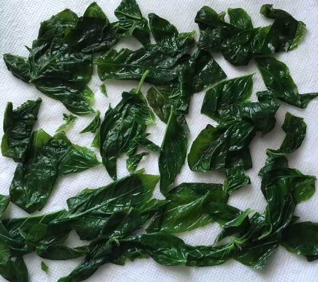 Paso opcional para ayudar a conservar el color verde: blanquear las hojas de albahaca y rampa en agua hirviendo durante 30 segundos, escurrir inmediatamente en un baño de hielo, lo más fácil de usar una araña para tirar de la albahaca y rampas derecha hacia fuera y en el agua de hielo. Transferencia a toallas de papel o una toalla de plato limpio y seco, así como usted puede.