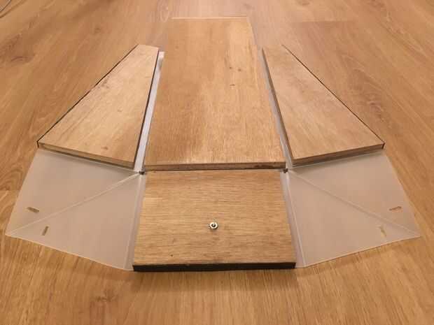 me dieron unas hojas de 90 x 180 cm (3 x 6') de madera ligeramente usado que estoy en el proceso de reasignación.Desde que tengo uso de un par de sillas extras de vez en cuando, recientemente saqué este taburete ranurado (paquete plano) en Sketchup.H