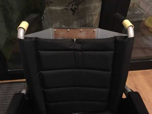 Este gadget es para mover una silla de ruedas en el lugar con fines de acondicionamiento físico. Consiste en 2 rodillos de tubos que llevan la silla de ruedas, una cadena y una rueda volante que se extiende el movimiento del usuario. Para ingresar o
