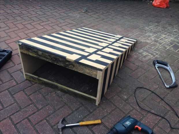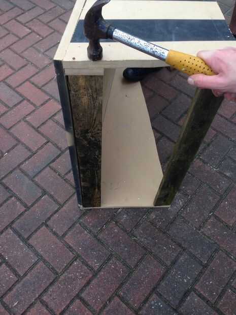 Ahora a mantener los lados juntos cuando la rampa se coloca bajo presión de toman los dos 32 "x 3" x 1 "pedazos de madera y de la endecha uno en la parte superior e inferior de la parte delantera de la rampa 2 orificios a ambos lados de las piezas y del martillo los clavos.