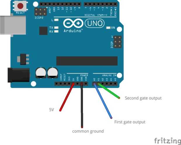 Conectar el arduino es muy sencillo. Las salidas GND y 5V deben ir a ambas puertas. Las salidas de una puerta va al pin A0 y el otro al pin A1.