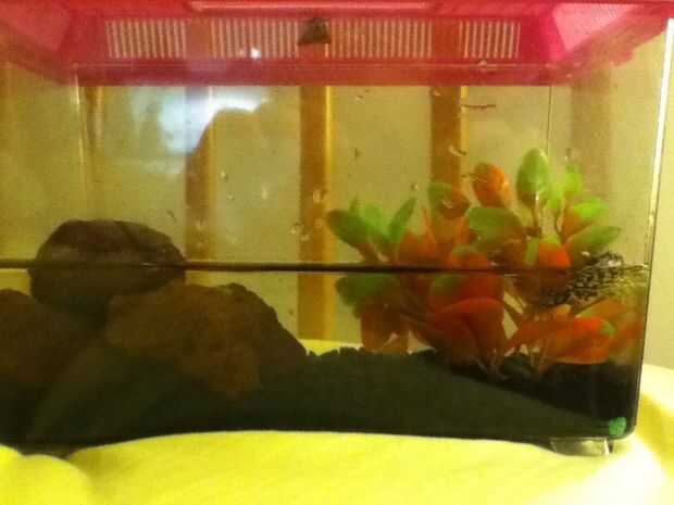 Ranas disfrutan de un ambiente que incluye lugares para esconderse. Una pulgada o tan o grava que cubre el fondo del tanque y un pequeño montón de piedras en una esquina sirve bastante bien. También se puede utilizar arena, pero no lo recomiendo, porque es difícil de limpiar, y cualquier alimento no comido parecen decaer más rápidamente. También he añadido una planta de plástico que he pedido en amazon por las plantas del jardin de la empresa. Si tienes el sistema correcto, las plantas vivas también son una opción. Sólo llene el tanque de aproximadamente 1/3 del camino con agua, porque no desea que la pila de la roca para estar completamente sumergida. Cambie el agua una vez cada 10 días, o antes, dependiendo de la rana. Nunca utilice jabón o lejía para limpiar un tanque de rana porque las ranas absorben sustancias químicas a través de su piel. Use sólo agua caliente y lávese las manos después de cualquier animal doméstico. Si usted elige hacer la rana, enjuagar las manos con agua caliente, pero sin jabón