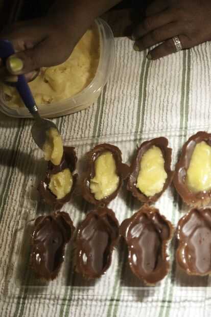 • Cepillo de chocolate sobre el molde en 2 manos, pensar, poner en el congelador después de cada - extender la segunda capa más allá del borde del molde para un mejor ajuste