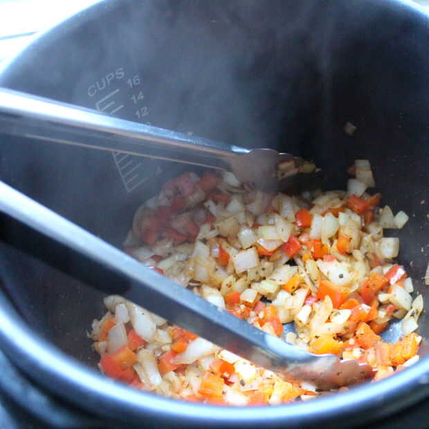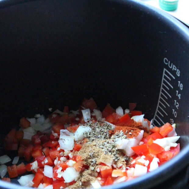 Añadir las verduras y especias a la olla y cocer durante un par de minutos o hasta que las cebollas estén ligeramente suave y translúcido.