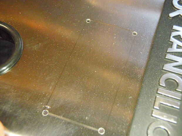 3/32 agujeros perforados en cada esquina del trazado de recorte, luego se apaga a las carreras con mi Dremel y un disco de corte reforzado.