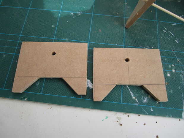 Perforar agujeros en el mdf que eventualmente se convertirá en los lados cortos. Los agujeros son 1 cm de diámetro. Entonces lijar los agujeros para encajar el 1 cm de espiga de diámetro.