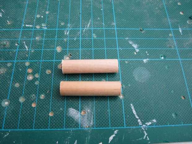 Los tacos son de 1 cm de diámetro y 2 cm de longitud. Continuó con la perforación de agujeros en el centro con una broca de taladro que es de 0,6 cm de diámetro. Arena dentro de los agujeros para que las clavijas que van a través no se atascan.