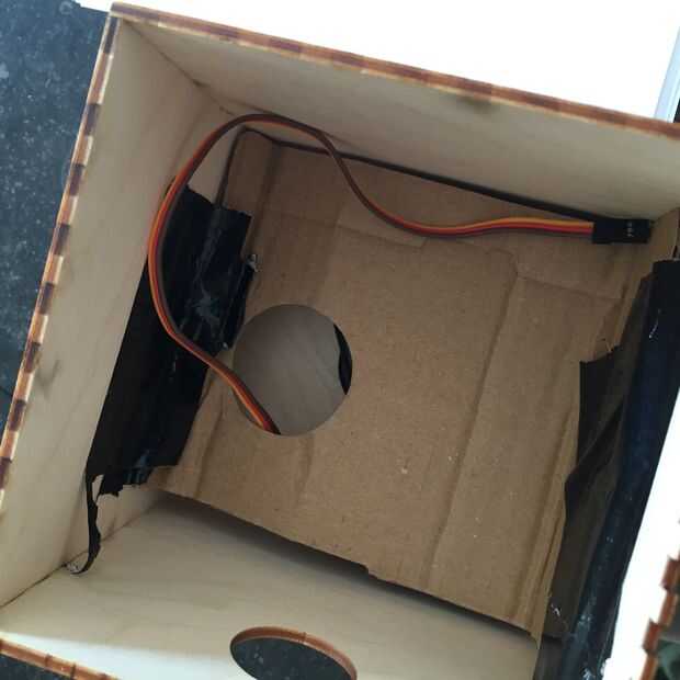 Zorg er ook voor dat er en dit stukje karton een gat zit waardoor de kabeltjes van Kunnan servo. En plaats vervolgens de servo tussen het stukje karton en de bovenkant van het doosje.