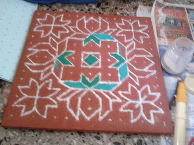 Rangoli is Indian folk art..Se utiliza generalmente para el propósito decorativo...Su un arte hecho a mano, que contienen formas geométricas fácil.En la India rangoli cada mujer sabe y conoce lo fácil a lo..Se hace por el color de polvo.Por este medi