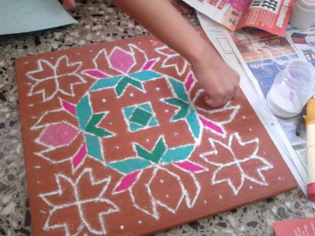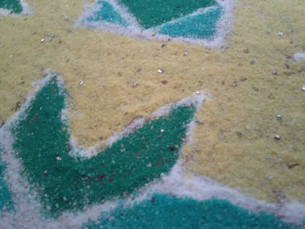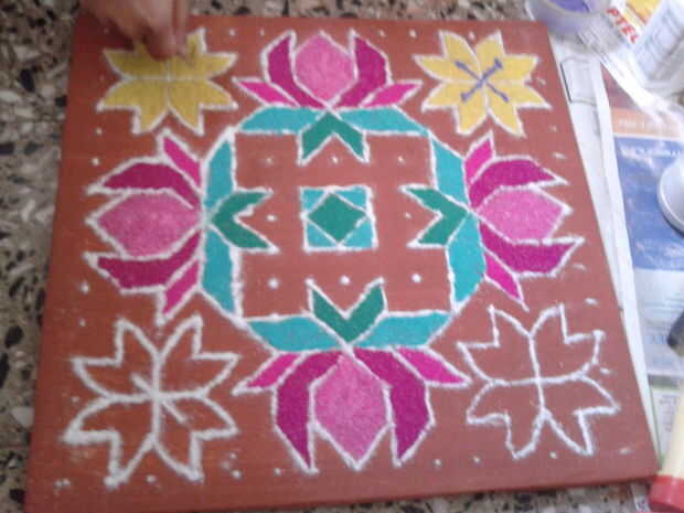 Rangoli, también conocido como Muggu, Kolam es un arte popular de la India en que patrones se crean en el piso en salones o patios materiales tales como arroz, de color seco harina, arena o flores de pétalos de color. Se hace generalmente durante Diw