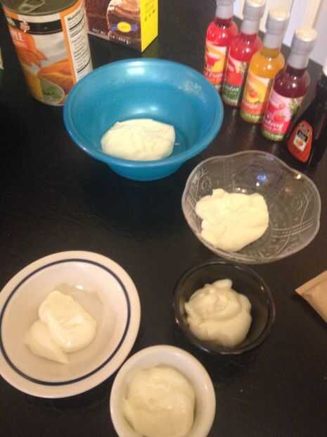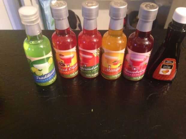 Teníamos un pack de sampler de margarita tamaño prueba mezclar en diferentes sabores. Tuvimos sangre margarita naranja mix, mix de margarita de sandía, mix margarita fresa y mezcla tradicional margarita. Agregamos cada uno de ellos a su propio tazón de fuente con la salsa que sumerge básica.