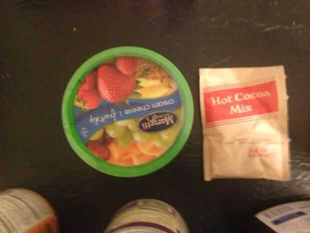 Una tina de inmersión de frutas dulce crema de queso, generalmente encontrado en el pasillo de productos frescos de su tienda y añadir en lo que queda fuera de la lata de leche condensada. Esto podría ser mucho, eso está bien. Añadir dos cucharadas de miel y revuelva, llama la atención una pose cada diez segundos o menos.