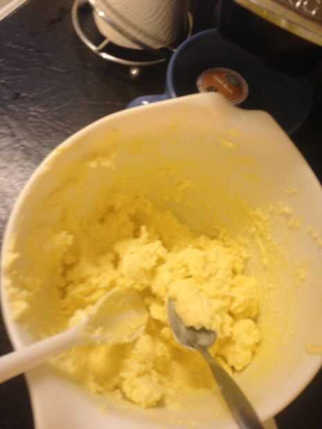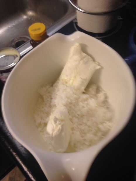 La mezcla de polvo de la mezcla con el queso crema primero. Este es por lejos la parte más áspera de la empresa. Se necesita cierta fuerza en los brazos seria para que esto suceda, o un buen mezclador/mezclador funciona de maravillas, también. Una vez es sobre todo mezcla bien, añade un poco de leche (estamos hablando de dos onzas de leche max), dos onzas de leche condensada, dos cucharadas de miel y una taza de copos de coco.