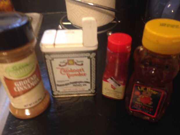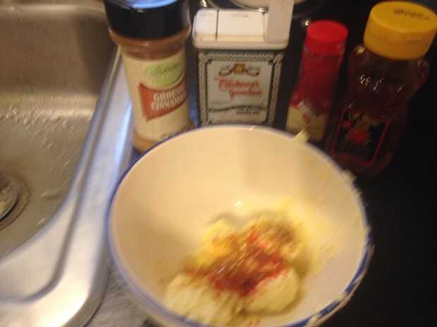 Tomar cuatro cucharadas del relleno básico y agregar más miel (sobre otra cucharada), media cucharadita de polvo de Tandoori, una pizca generosa de canela azúcar y una cucharadita de bolitas de canela escarchadas.