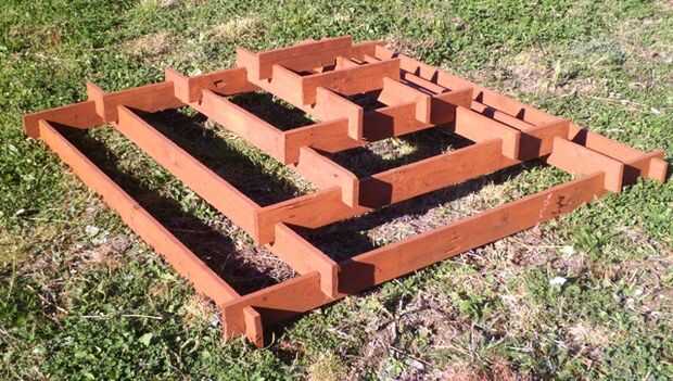 Después de un par de capas de preservativo de madera el plantador de la pirámide está ahora listo para ser montado y colocado en su posición final antes de llenar con compost y agregar las flores y plantas.