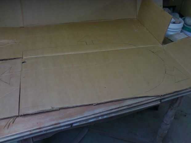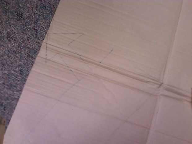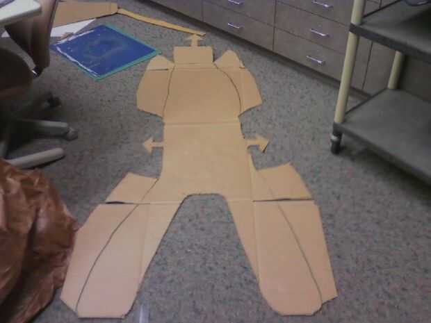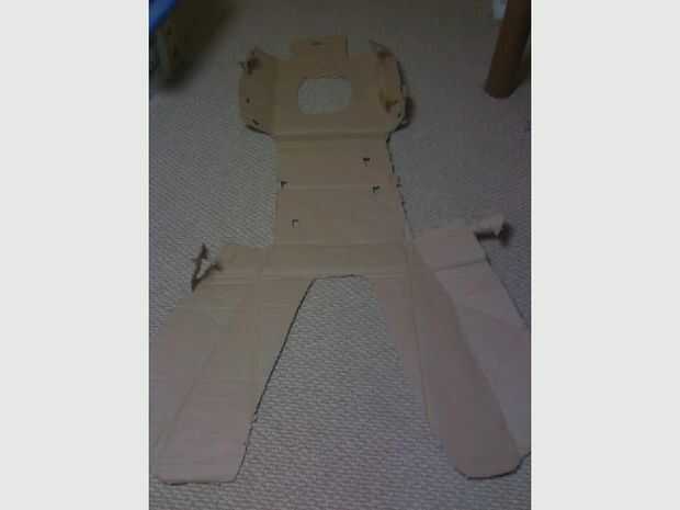 Utilizar hoja de cartón brazo posterior (S2) para trazar las dimensiones de la pieza del brazo posterior (P2). Dibujar las dimensiones (documentadas en el correspondiente cuadro abajo) sobre la hoja de cartón brazo posterior (S2) con un lápiz (T4). Asegúrese de usar una regla (T3) para asegurarse de que todas las líneas son rectas. No habrá pliegues en esta pieza por lo que no se utiliza el marcador (T5). Coloque la hoja de cartón brazo posterior (S2) con las dimensiones descritas sobre una almohadilla de corte (T1). Con un cuchillo corte (T2) en las líneas dibujadas con un lapiz (T4). Con la navaja (T2) cortado con ranura Y. Nota: tenga cuidado de cortar las pestañas porque son fundamentales para armar el traje. Hay un error en la imagen de abajo hay una pestaña dibujada en el lugar de la ranura Y. Hice un cambio en el diseño y no hay ninguna ficha en ese punto.