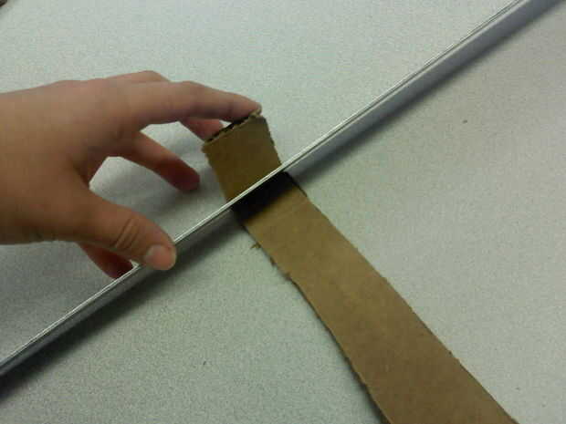 3. use un ruler(T3) a arrugarse el carboard(S3) 2 pulgadas en cada extremo. Use la regla para medir 2 pulgadas de cada extremo y trazar una línea. Luego coloque la regla en esa línea y presione hacia abajo para hacer un pliegue puede doblar
