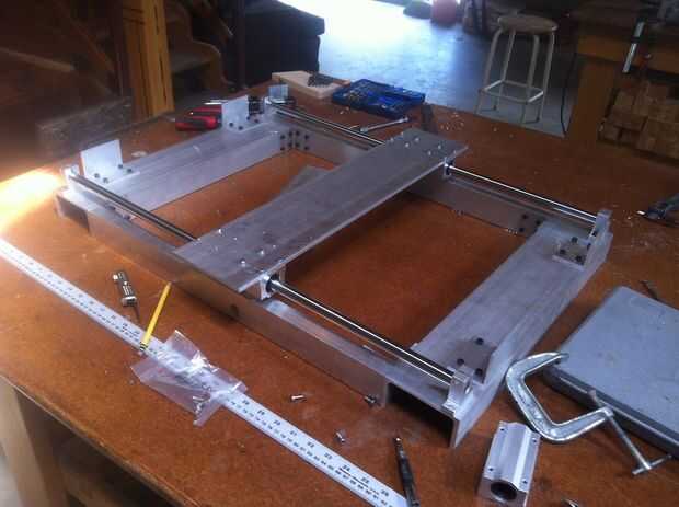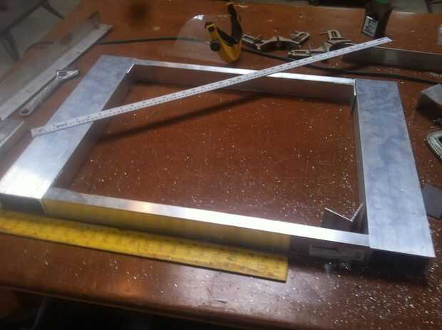 El marco construido en su mayor parte 1/4 en aluminio 6061 de onlinemetals. Todos los cortes de aluminio se realizaron utilizando un estándar ingletes Sierra equipado con una cuchilla de carburo. Corte fue muy preciso y muy rápido, incluso cuando 1/4x3in placa de corte. Una prensa del taladro era esencial para este proyecto. Rápidamente aprendí que un punzón no ayuda en absoluto con alineación de agujeros si decide perforar a mano.