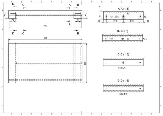 Actualización: 12 mm barras parecían colgar a través de demasiado. Por lo tanto, el diseño fue cambiado para el uso de tubos de 18mm. El dibujo con las dimensiones mantiene igual, sólo en caso de perforación de agujeros de 12mm, 18mm agujeros tienen a taladrar!