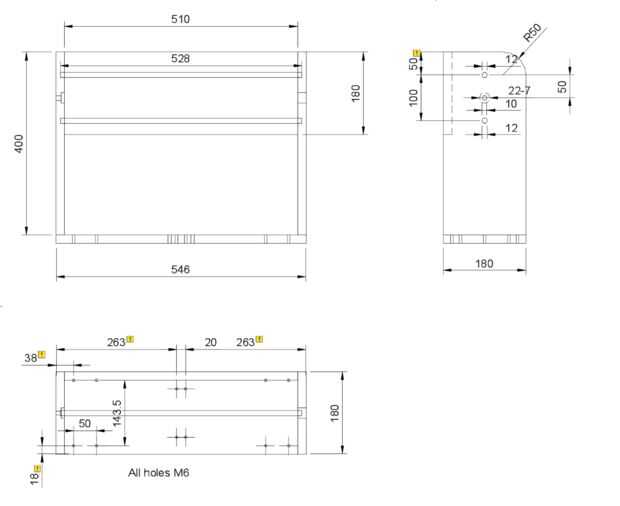 Nota: En el panel de la izquierda, el orificio de 22mm es sólo 7mm de profundidad (rodamiento) y atraviesa el agujero de 10mm. En el panel derecho, atraviesa el agujero de 22mm (debido a la tuerca de acoplamiento).
