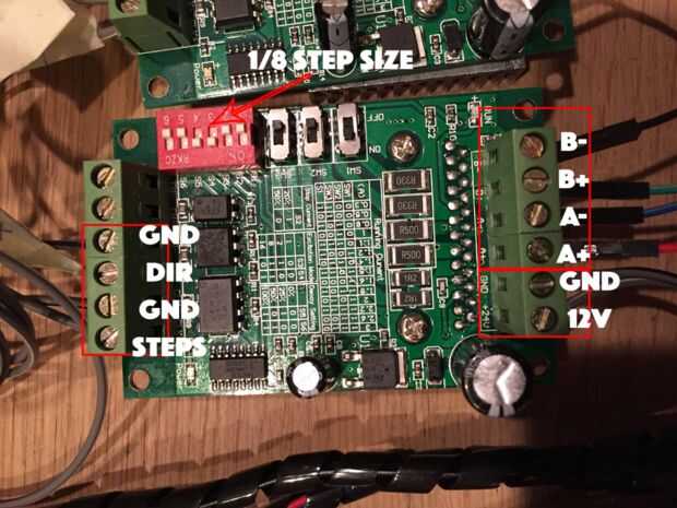 Los interruptores en el conductor del motor no están realmente claros para mí aún, pero con S3 y S4 en esta forma, el tamaño de paso será de 1/8 del tamaño de paso normal, es mucho más suave y precisa pasos.