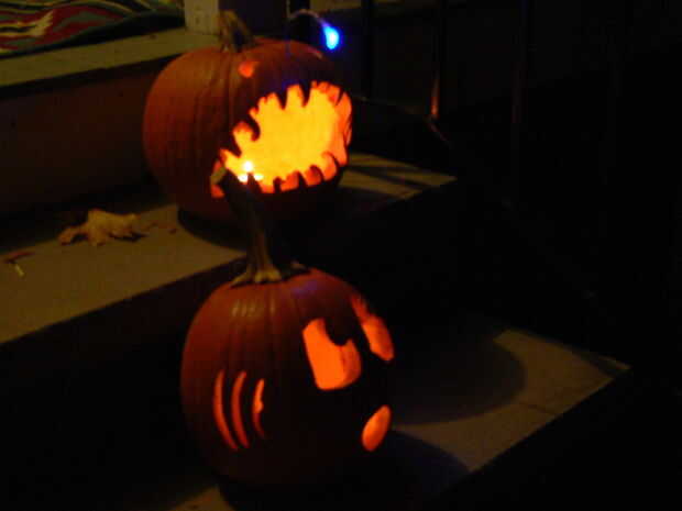 Perforar el extremo inferior de la 'linterna' a través del frente de la calabaza para formar un agujero. Este es un buen lugar para los cables a través del hilo de rosca para mantener fuera de la vista. Perfore otro agujero en la parte trasera de la calabaza para una salida de cable. Pase los cables a través del primer agujero y el agujero de salida, luego vuelva a colocar la linterna en su agujero original. Puede ser un calce ahora que está compartiendo el espacio con sus cables.