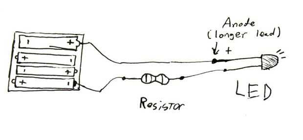Conecte el soporte de la batería y el resistor a los cables de la lámpara LED como se muestra. Recuerda estar seguro del ánodo (más plomo; positivo) identificó anteriormente está conectado a la + de la pila. Si se han conectado todo y el LED no luz, pruebe a invertir los cables al LED.