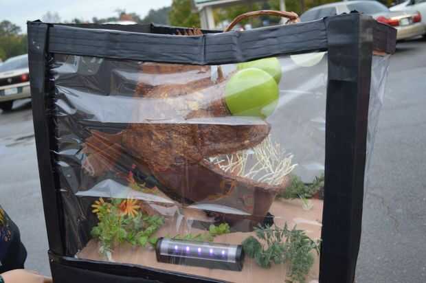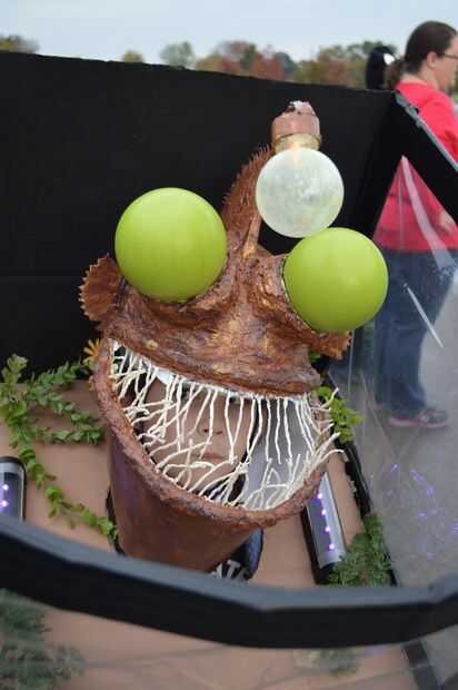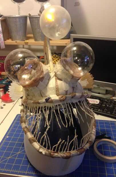 Cubrimos un casco de bicicleta con bolsas de plástico y cinta adhesiva para crear la forma. Las aletas fueron cortadas de cajas de cartón y attched con cinta de enmascarar, la luz fue unida al alambre floral con cinta de enmascarar.