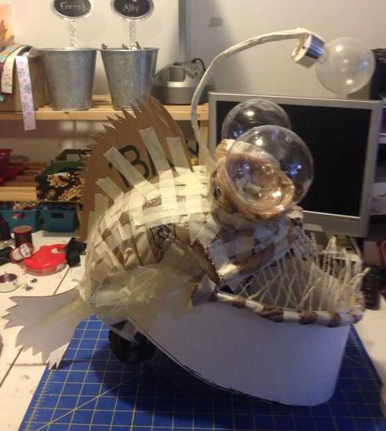 Después de la forma de pescados del Angler, cubrimos con papel maché ', dejar secar y pintar con pintura acrílica.