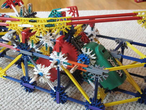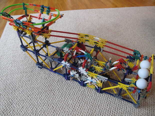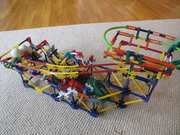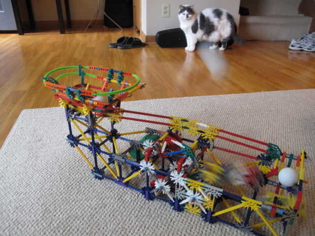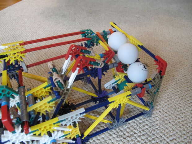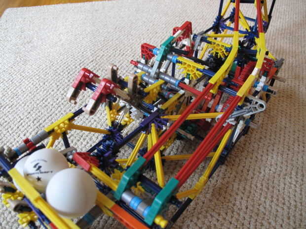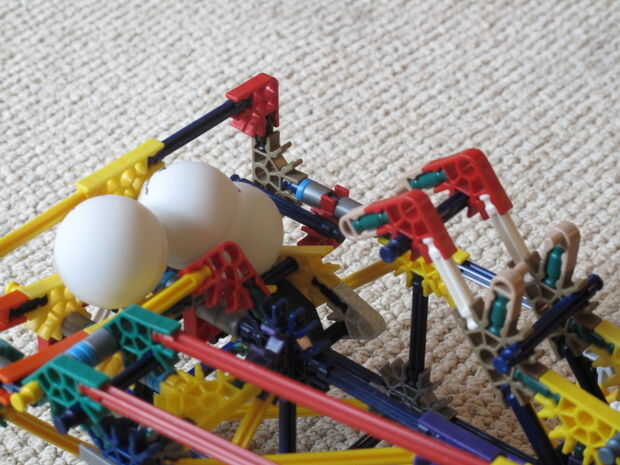 Se trata de una escultura cinética que catapulta pelotas de ping pong en el aire, en una cesta y de nuevo a la catapulta. Funciona para como quieres hacerlo con un motor y una potencias de goma la catapulta. Un mecanismo al final permite que cada bola cargar en la catapulta uno por uno. Es una máquina inútil, pero divertida de ver. :-)