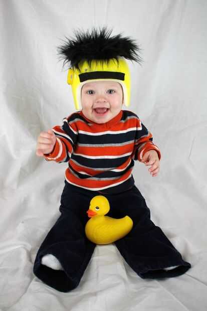 Mientras que el suéter de rayas naranjas y azules como Ernie, casco de mi hijo es un Bert muy amarillo. Así que decidimos hacer un mashup de Bert y Ernie (Bernie?). Pensar en él como niño de amor de la pareja de tu muppet favorito.