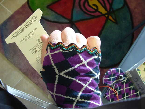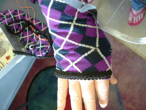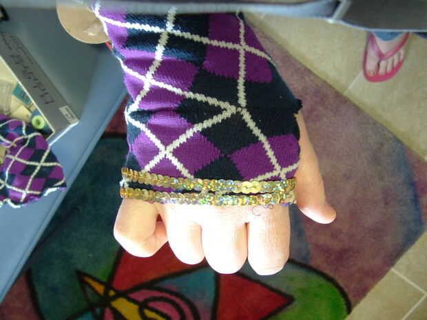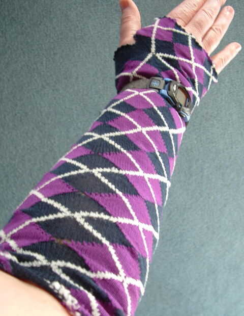 Para los calentadores de brazo, orificio de aproximadamente 1/2 pulgada en el talón del calcetín para el pulgar. puede añadir un recorte alrededor de los bordes superior e inferior si lo desea y entonces la cosa en el. Asegúrese de tener suficiente ajuste para encajar alrededor de su mano (y brazo) cómodamente. Podría funcionar mejor si se utiliza un ajuste elástico. Para el registro, siempre que he intentado zigzag los bordes del calcetín, quería estirar y ser ondulado. Usted podría utilizar esto a su ventaja si quiere poner un borde de"lechuga" en ellos. Usted también puede dejar el borde abatible y látigo-stich en lugar de mano, que es mi elección personal. Si es recta la puntada, mejor funciona, pero luego realmente no estira.
