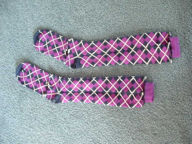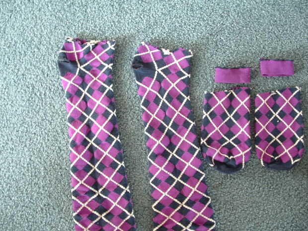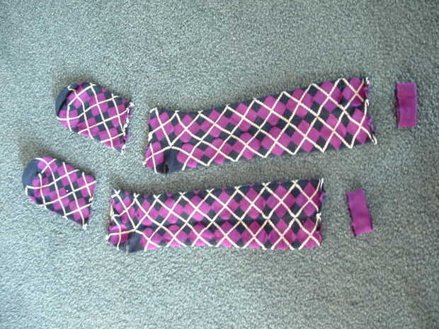 Cortar en tres pedazos. Ya había cortado estos antes de que me decidí a hacer este instructable, así que por favor imaginar están todos en una sola pieza. Primero cortar los dedos del pie, (yo usé las tijeras dentadas) y luego cortar las bandas superiores. Los dedos de los pies que vamos a utilizar para nuestro mono calcetín y nuestra portada de MP-3. La parte principal del calcetín para nuestros calentadores de brazos y las mejores bandas para nuestros titulares de cola de caballo.