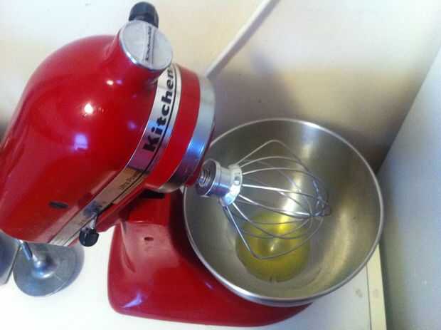 Bata las claras hasta que estén espumosas y empezando a formar picos suaves. Añadir el azúcar restante (2T en caso usted no ha estado guardando la pista) y látigo hasta que formen picos.