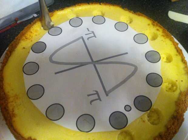 Corte la plantilla para que usted puede colocarlo en la parte superior del pastel. Entonces, usando tu wilton bismark (o masa similar tamaño punta o dispositivo circular) como un sacador de agujero, poke círculos fuera de tu pie justo al lado de donde están en la plantilla. ¡ No olvides el punto decimal! Utilicé un palillo de dientes para eso. Hablando de palillos de dientes, usted probablemente necesitará de pie su punta de pastelería con palillos de dientes a lo largo de la manera. Comer los pedacitos de pastel desechados para Recompénsese antes para su control de sí mismo.